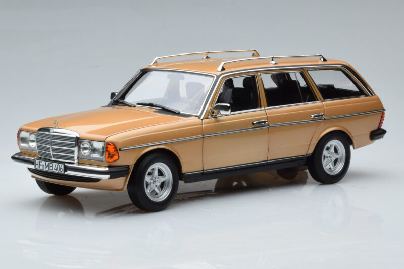 A 1:18 scale model measures approximately 25-28 cm (approximately 10-11 inches). The Mercedes 200T S123 AMG Package Bež Norev 1:18 is perfect for display in a glass cabinet or on a shelf.