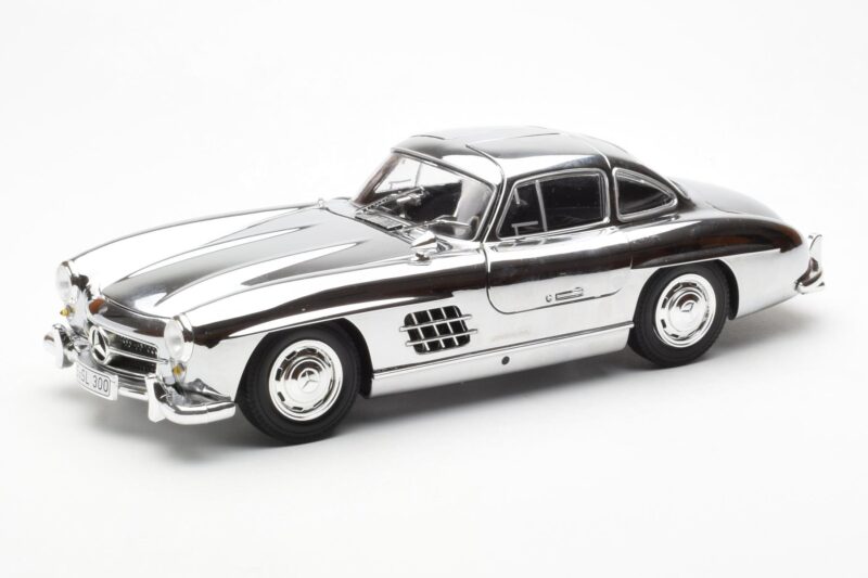 The Mercedes 300 SL W198 Krom Minichamps 1:18 is crafted from Kovina. Die-cast zinc alloy body with detailed plastic parts, rubber tires, and high-quality paint finish. Die-cast models are known for their weight, durability, and realistic feel.