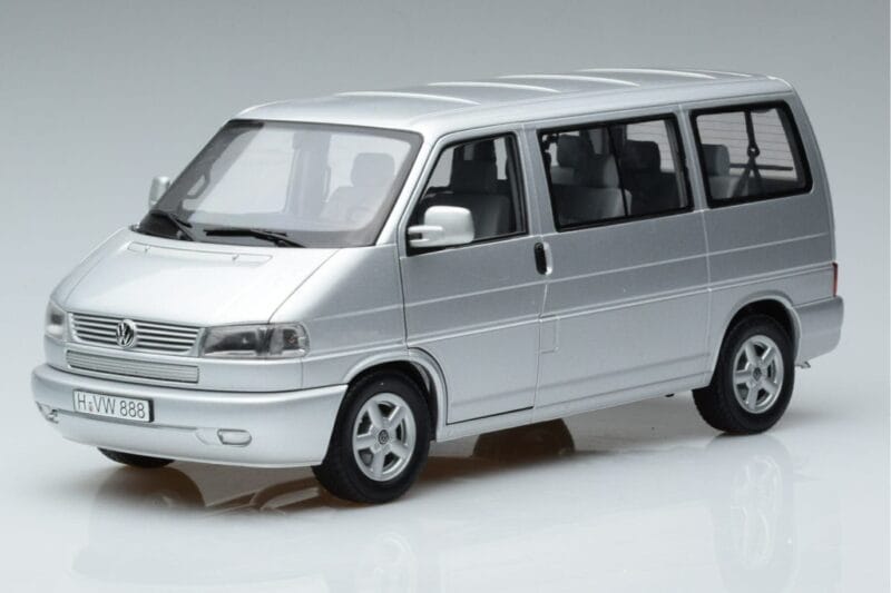 A 1:18 scale model measures approximately 25-28 cm (approximately 10-11 inches). The Volkswagen T4b Transporter Caravelle Minibus Schuco 1:18 is perfect for display in a glass cabinet or on a shelf.